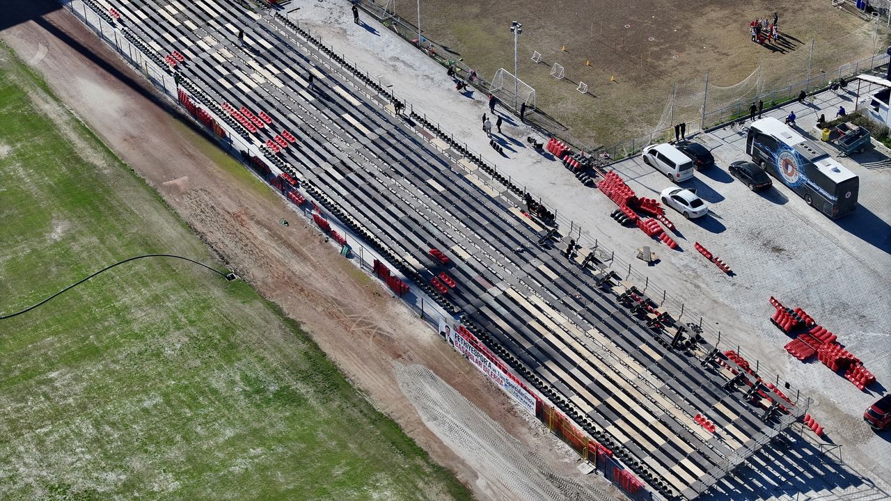 Deprem analiz raporları olumsuz çıkan stadın betonarme tribününün yıkıldığını kaydeden Yiğit, "Onun yerine portatif bir tribün ekleme yapmamız gerekti. 3 bin kişilik tribün imalatı devam ediyor. Pazartesi, salı gibi de tribün işi bitmiş olacak." bilgisini verdi.