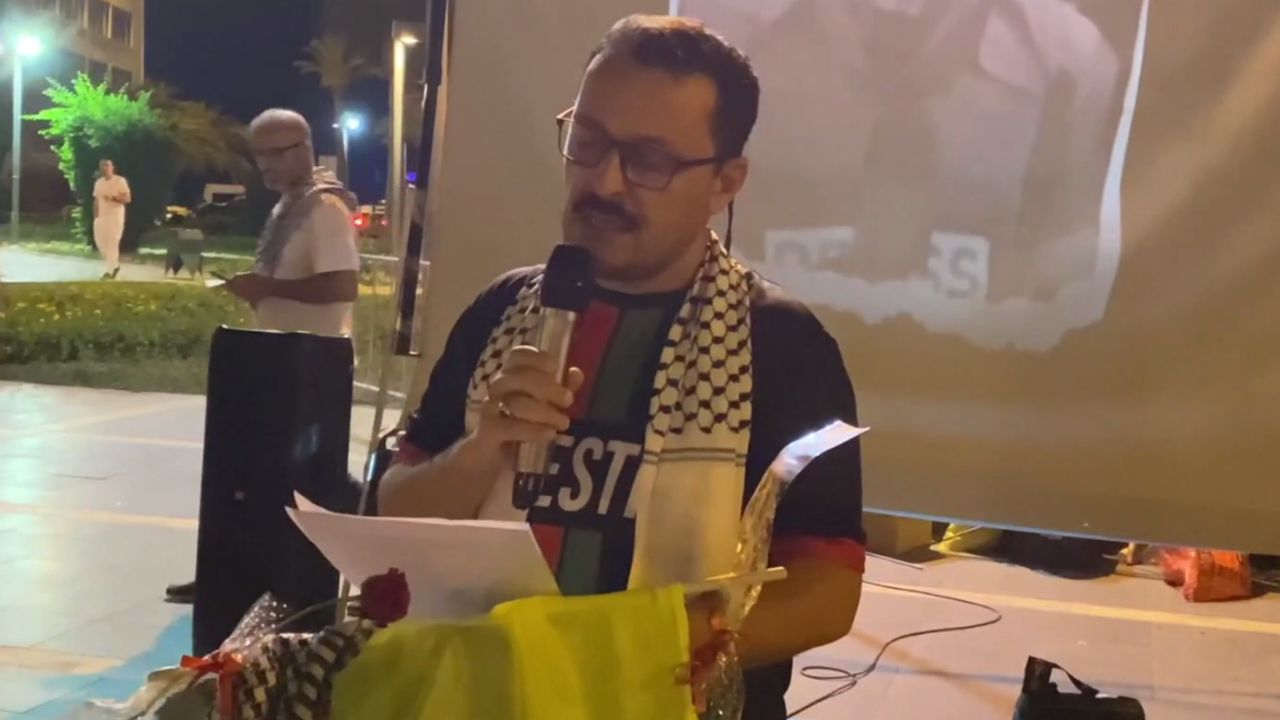 İsrail aleyhine sloganların atıldığı gösteride, İsrail ordusunun Gazze kentindeki Şifa Hastanesi çevresinde bulunan gazeteci çadırına düzenlediği doğrudan saldırıda hayatını kaybeden Al Jazeera muhabiri Enes eş-Şerif'in ölmeden önce kaleme aldığı vasiyeti gazeteci Alkın Biricik tarafından okundu.
