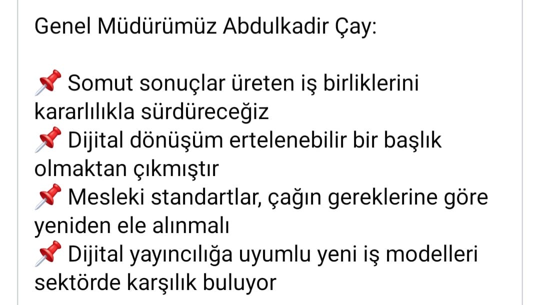 “Kurumumuzu sektörün üzerinde konumlanan bir yapıdan ziyade sektörle birlikte düşünen, çözüm üreten ve basının güçlenmesini kendi sorumluluğu olarak gören bir anlayışla yönetiyoruz. İnanıyoruz ki güçlü bir basın ancak karşılıklı güvenle ve uzun vadeli bir vizyonla mümkündür. Bu istikamet doğrultusunda değişen dünyayı doğru okuyan, sektöre temas eden ve çözüm üretme iradesini kararlılıkla ortaya koyan bir Basın İlan Kurumu anlayışıyla yolumuza devam edeceğiz.”