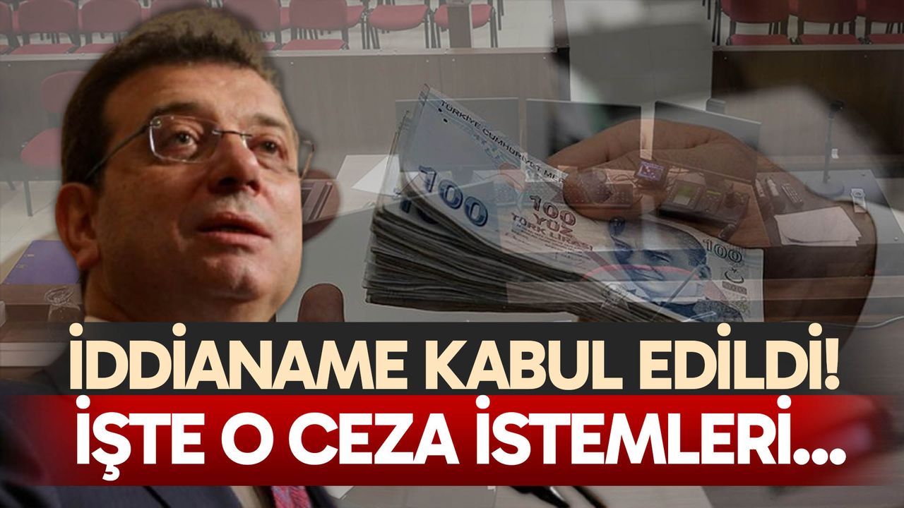 İddianamede, tutuklu sanık Ekrem İmamoğlu'nun "suç işleme amacıyla örgüt kurmak", "kişisel verilerin kaydedilmesi" "kişisel verileri ele geçirme ve yayma", "suç delilerini gizleme" "haberleşmenin engellenmesi", "kamu malına zarar verme", "rüşvet", "halkı yanıltıcı bilgiyi alenen yayma", "irtikap", "kamu kurum ve kuruluşları zararına dolandırıcılık" "suçtan kaynaklanan mal varlığı değerlerini aklama", "ihaleye fesat karıştırma", "çevrenin kasten kirletilmesi", Vergi Usul Kanunu, Orman Kanunu ve Maden Kanunu'na muhalefet suçlarından toplam 849 yıldan 2 bin 430 yıl 6 aya kadar hapisle cezalandırılması isteniyor.