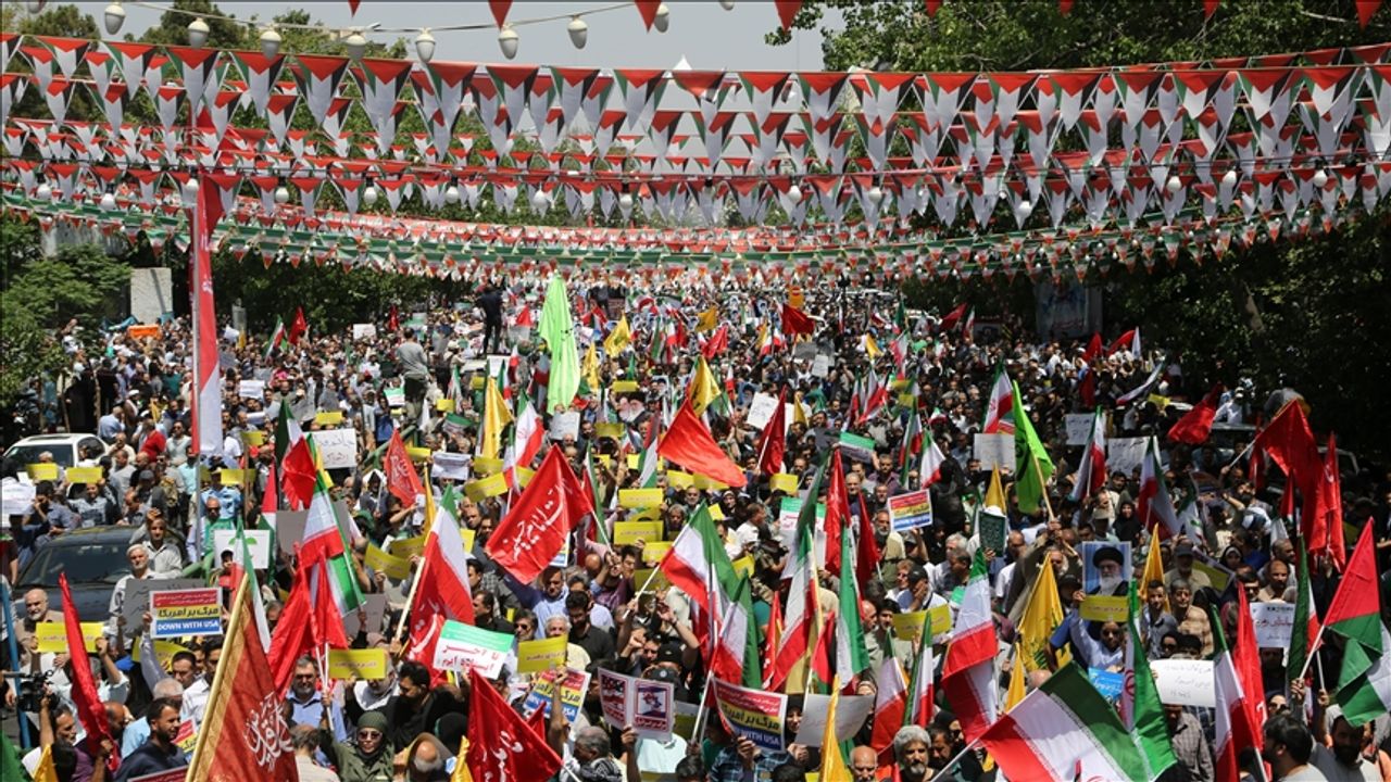 Dünya Haber - Tahran Üniversitesi yerleşkesinde kılınan cuma namazının ardından toplanan on binlerce kişi, İsrail ve ABD karşıtı sloganlar attı. Göstericiler, İran ordusuna destek mesajları içeren dövizler taşıdı.