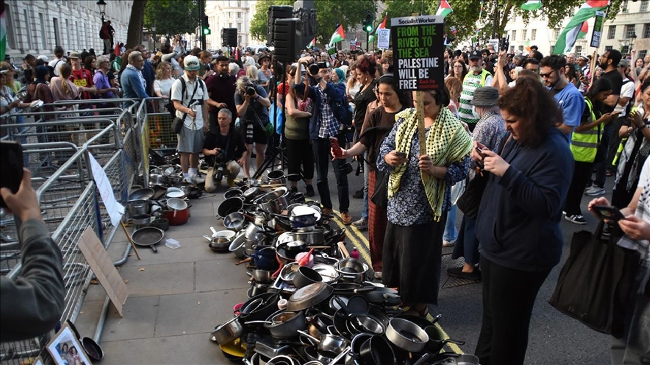 Dünya Haber - "Filistin Dayanışma Kampanyasının (PSC)" çağrısıyla İngiltere Başbakanlık Ofisi 10 Numara'nın bulunduğu Downing Sokağı girişinde düzenlenen gösteriye binlerce kişi katıldı. Eylemciler, tencere ve tavalara vurarak, yardım girişine izin vermeyip Gazze halkını açlığa mahkum eden İsrail'i ve bu ülkeye silah satmayı sürdüren İngiltere'yi protesto etti.