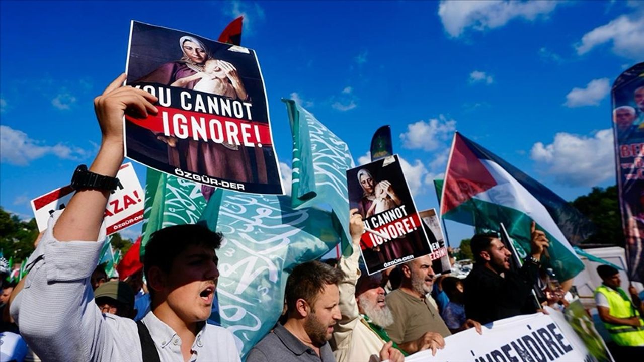 "Katil ABD katil İsrail", "Aksa tufanı siyonizmi yenecek", "Katil ABD Orta Doğu'dan defol" ve "Yaşasın ümmet dayanışması" şeklinde sloganlar atan gruptaki bazı göstericiler, yürüyüş sırasında Gazze'deki açlığa ve kıtlığa dikkati çekmek amacıyla boş tencerelere kaşıkla vurarak ses çıkardı.