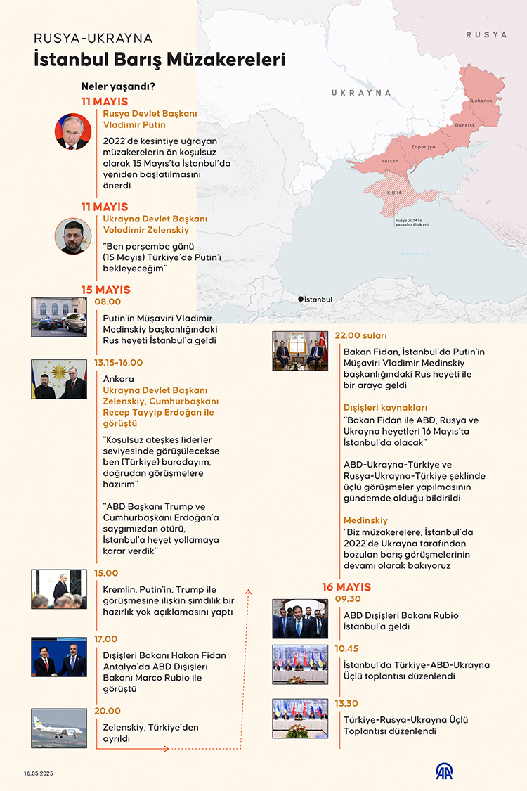 Rusya Devlet Başkanı Vladimir Putin, 11 Mayıs’ta, 3 yıl önce kesilen doğrudan müzakerelerin ön koşulsuz olarak 15 Mayıs'ta İstanbul'da yeniden başlatılması önerisini gündeme getirerek Cumhurbaşkanı Erdoğan'dan ev sahipliği yapmasını talep etti.