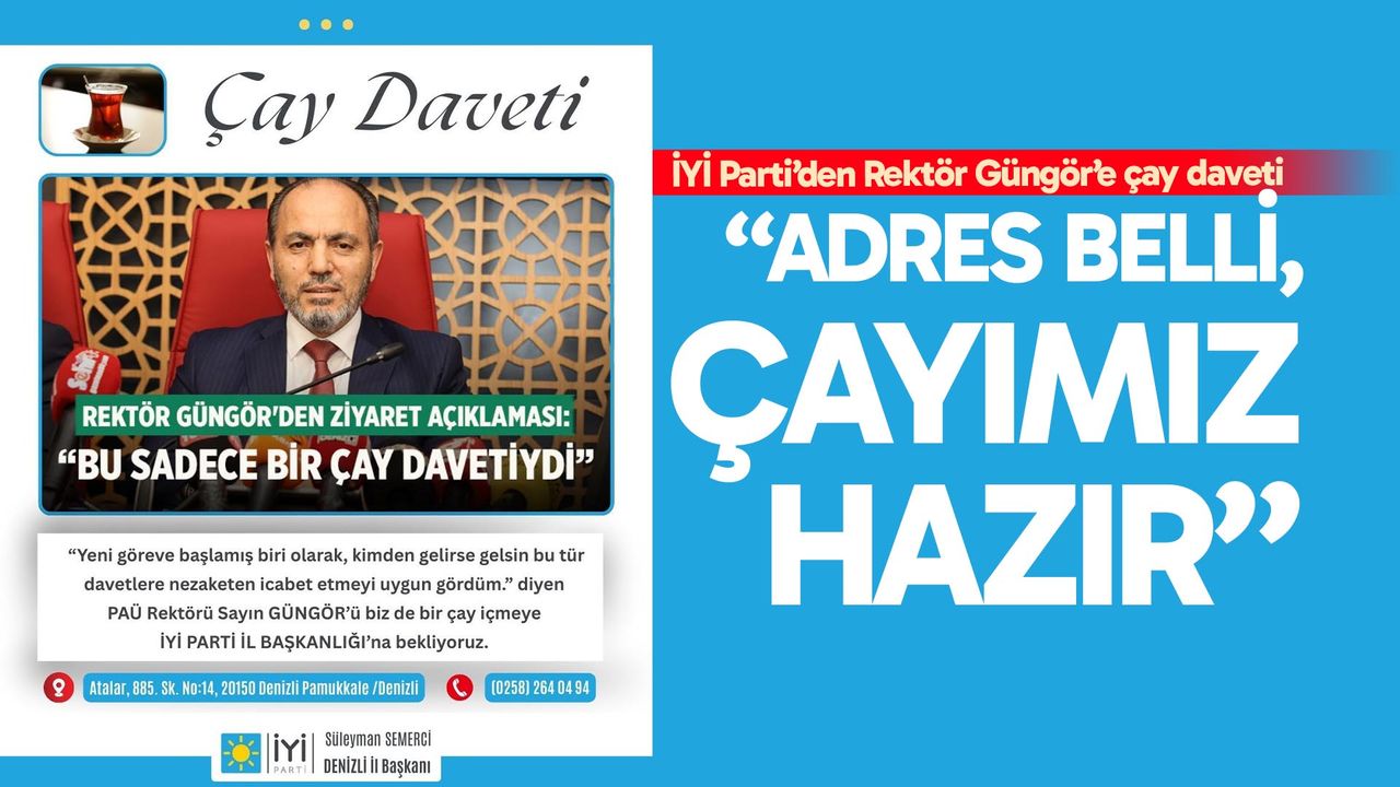 İl Başkanlığının sosyal medya hesabından yapılan paylaşımda, “Yeni göreve başlamış biri olarak, kimden gelirse gelsin bu tür davetlere nezaketen icabet etmeyi uygun gördüm" diyen PAÜ Rektörü Sayın Güngör'ü İyi Parti Denizli İl Başkanlığı’na çay içmeye bekliyoruz” denildi.