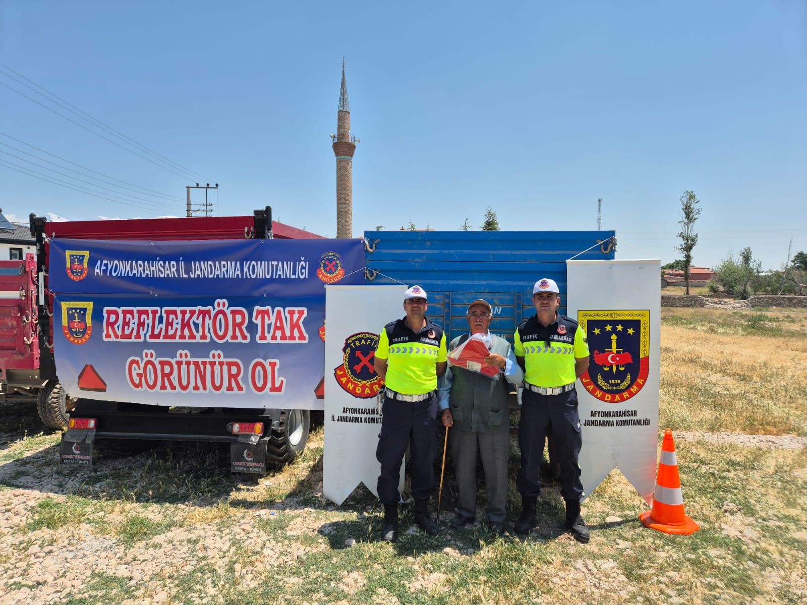 Gündem Haber - Afyonkarahisar İl Jandarma Komutanlığı Trafik Şube Müdürlüğüne bağlı Mobil Tarım Timi ve Emirdağ İlçe Jandarma Komutanlığı Trafik Jandarma Timi tarafından Emirdağ Yeniköy’de traktör römorklarında görünürlüğü sağlayan ve Karayolları Trafik Kanunu gereği kullanımı zorunlu olan üçgen reflektör hakkında bilgilendirme yapıldı. "Reflektör Tak Görünür Ol" projesi çerçevesinde traktörlerin karıştığı trafik kazalarının önlenmesi, azaltılması ve traktörlerin özellikle gece şartlarında görünürlüğünün artırılması amacıyla gerçekleştirilen eğitim sonrası traktör sürücülerine 75 adet üçgen reflektör dağıtıldı.