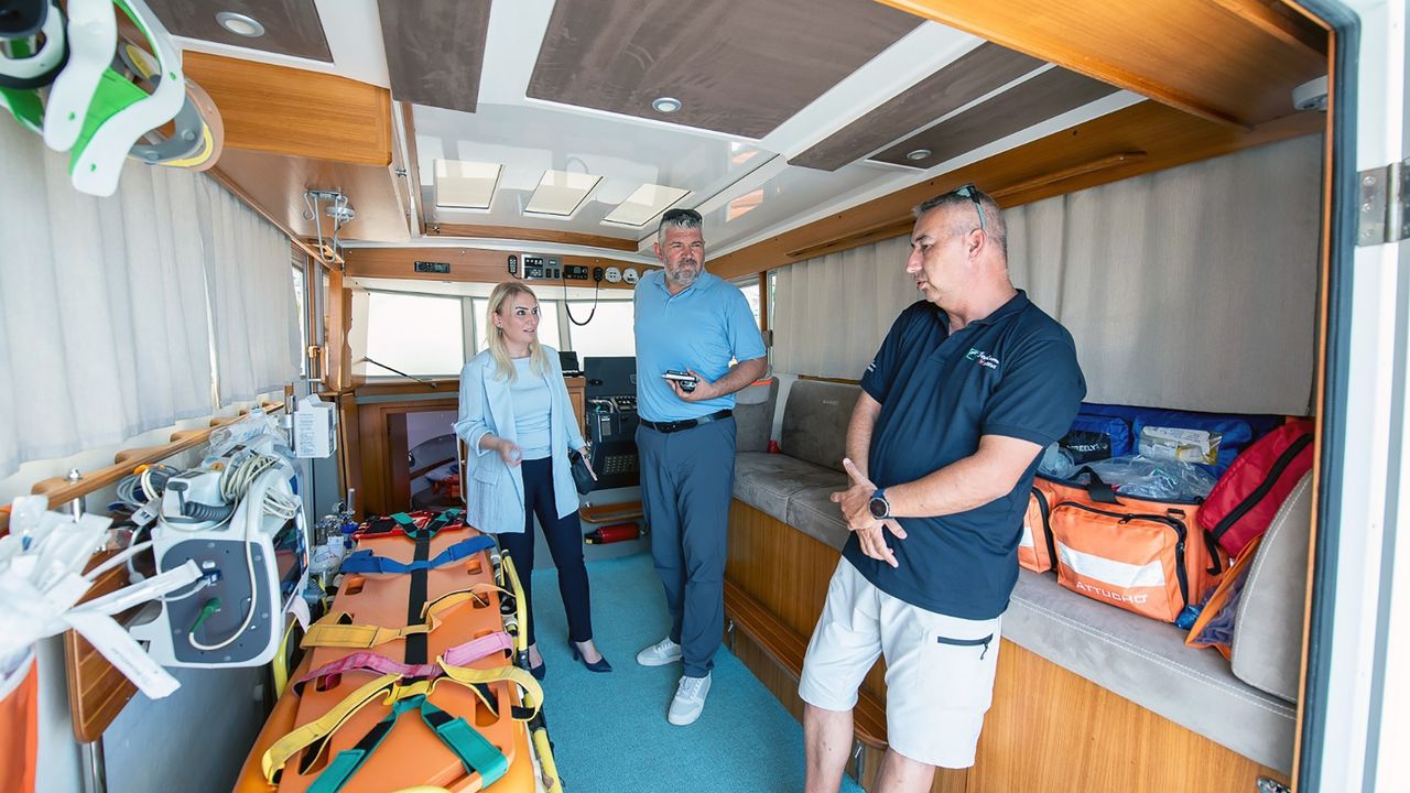 Akça, Bodrum Devlet Hastanesi ziyaretinin ardından Bodrum Deniz Kurtarma Derneği'ni ziyaret etti. Bodrum Marina'da gerçekleşen ziyarette, deniz ambulansı yerinde incelendi. Ziyaret sırasında Dr. Akça, Deniz Kurtarma Derneği yetkililerinden deniz ambulansının teknik donanımı ve kullanım kapasitesi hakkında detaylı bilgi aldı. 13 metre uzunluğa ve 3,65 metre genişliğe sahip olan Deniz Ambulansı, uluslararası B-Offshore sertifikasına sahip olup zorlu hava ve deniz şartlarda güvenli müdahale imkânı sunacak şekilde, Sağlık Bakanlığı'nın hava ve deniz ambulansları için belirlediği standartlara uygun olarak tasarlandı.