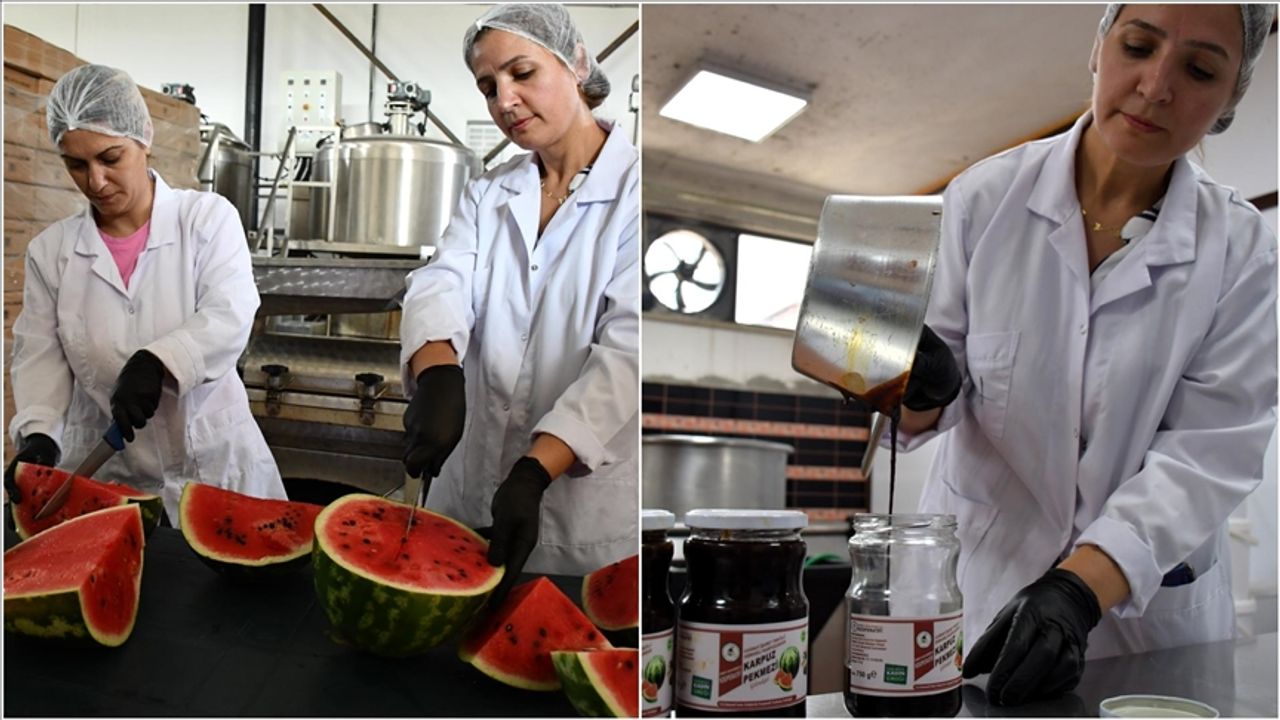 Tesiste, karpuzun suyu posasından ayrılıp sıkıldıktan sonra süzeklerden geçirilerek 7-10 saat arasında kazanlarda kaynatılıyor. Kadınlar tarafından işlenen günlük 200 ton karpuz, pekmeze dönüştürülüyor.