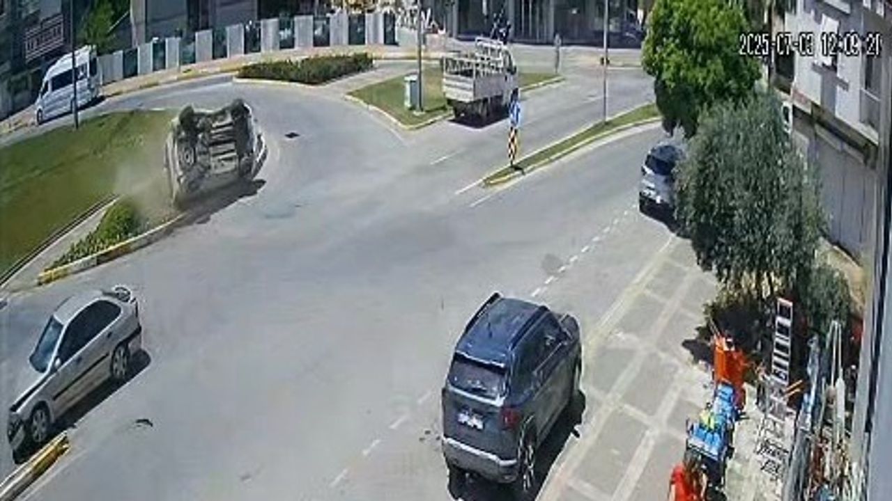 Gündem Haber - Manavgat ilçesi Aşağı Pazarcı Mahallesi Fevzipaşa Caddesi'nde meydana gelen kazada, Atatürk Caddesi istikametine seyir halindeki Hasan B.B.'nin kullandığı hafif ticari araç, Suphi D.'nin kullandığı otomobil ile çarpıştı. Güvenlik kamerasına saniye saniyesine yansıyan kazada, hafif ticari araç, çarpışmanın şiddetiyle sol tarafına devrilirken, kaldırıma çarptıktan sonra tekerlerinin üzerine geri düştüğü görüldü.