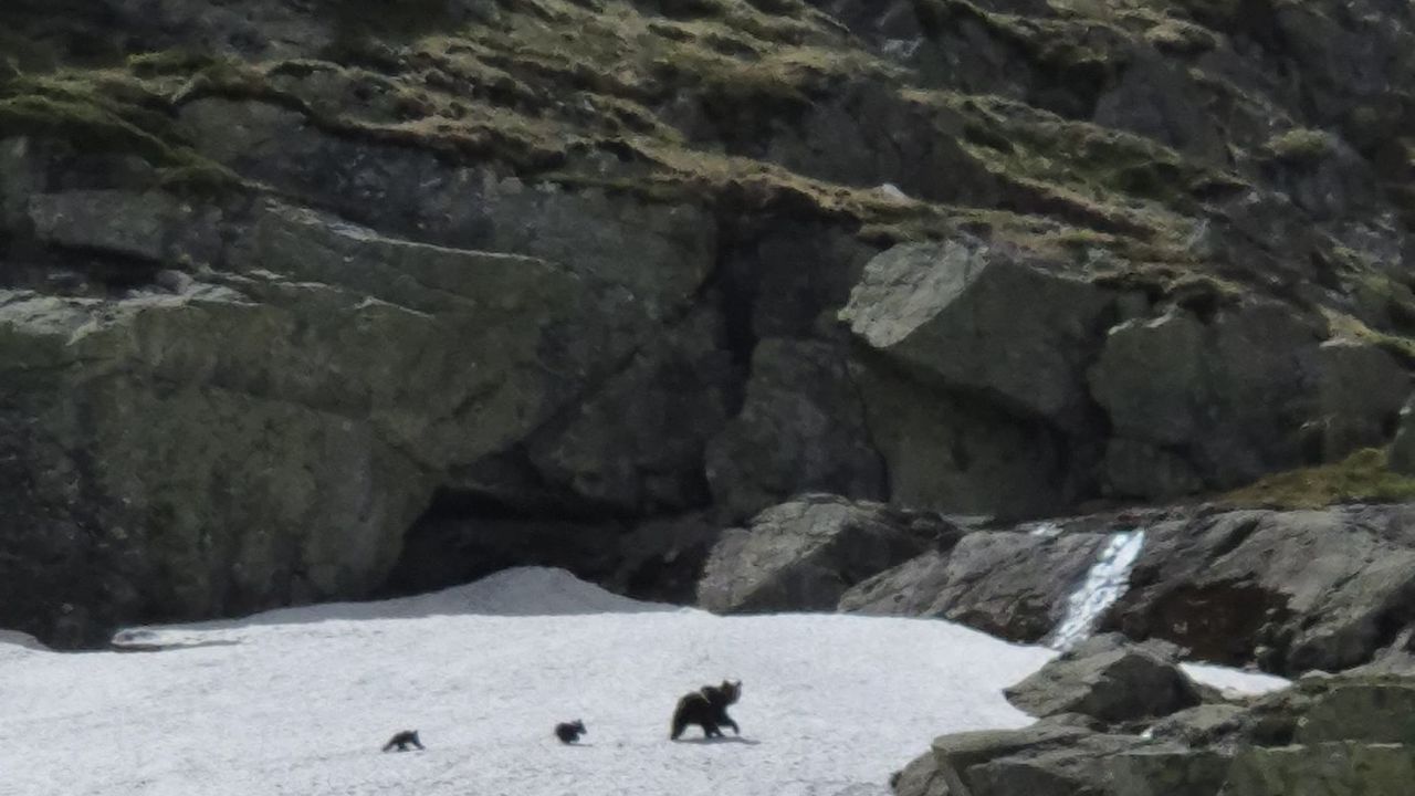 Mevsimlerin kayması sebebiyle havaların geç ısındığı hatta karın hala erimediği zirvede kış uykusunu tamamlayıp kaldıkları mağaradan çıkan anne ayı ve 2 yavrusu yiyecek ararken görüntülendi. Ayı ailesi bir süre sonra gözden kayboldu.