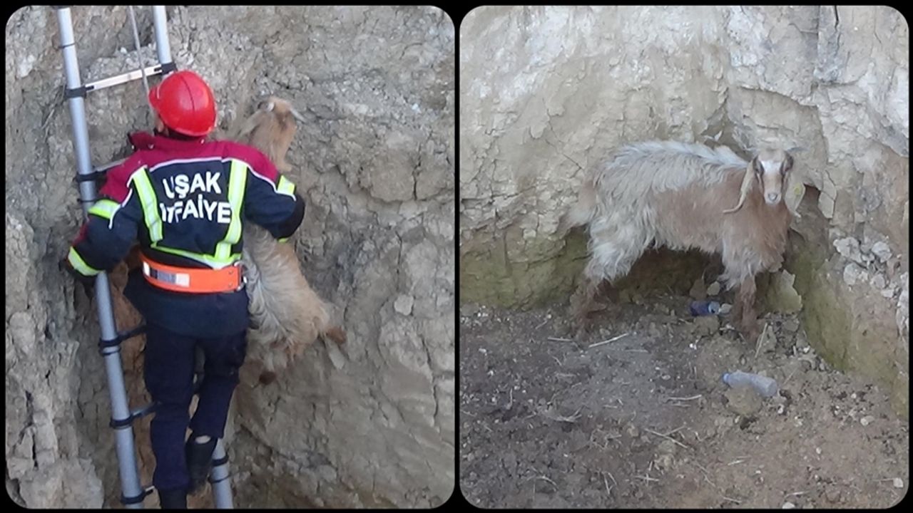 Bir merdiven yardımıyla kuyuya inen itfaiye ekipleri keçiyi bulunduğu yerden çıkardı.