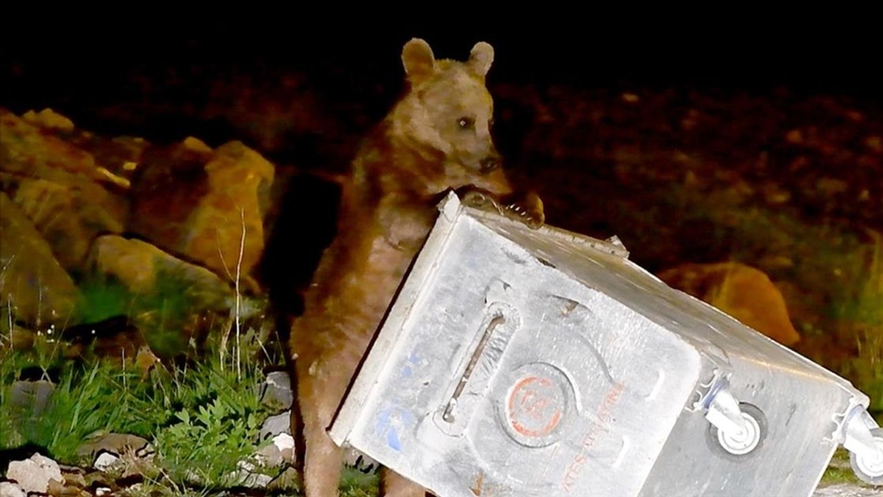 Ormanlık alandan Tepe Mahallesi Taşkıran TOKİ konutları bölgesine inen bir bozayı, çöp konteynerlerini devirip içine girerek yiyecek aradı.