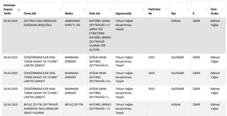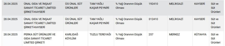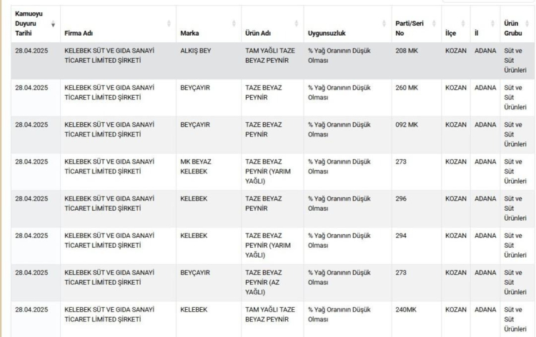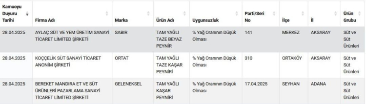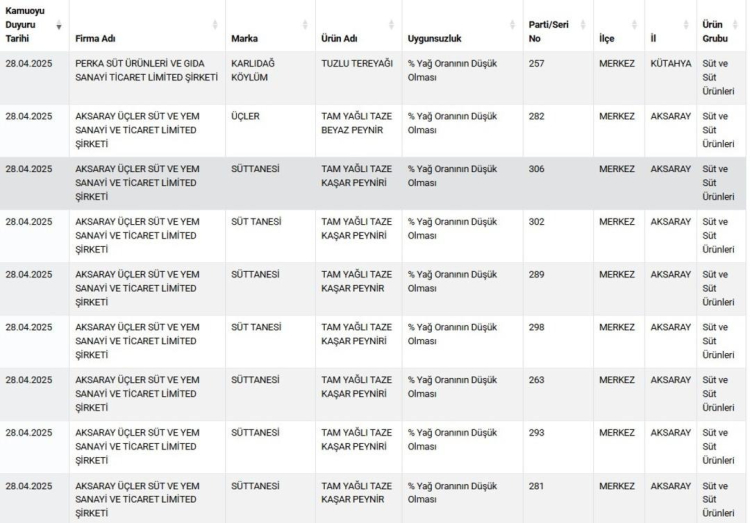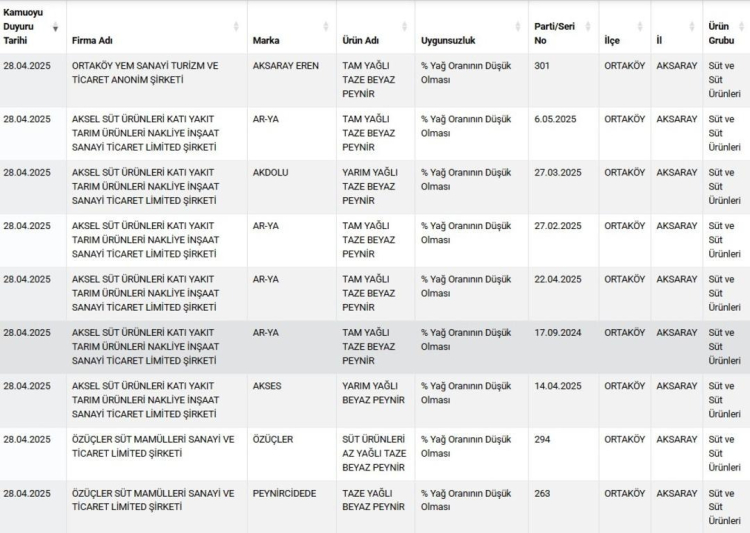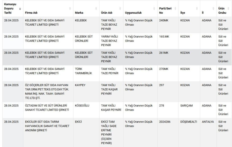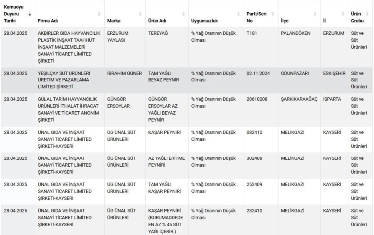 Firma adı ve markalarıyla duyurulan ürünlerde, tespit edilen uygunsuzluklar tek tek açıklandı. Buna göre; 'tam yağlı kaşar peyniri'nde % yağ oranının düşük olması, bitkisel yağ tespiti ve nişasta tespiti gibi uygunsuzluklar belirlenirken toz antep fıstığında da yer fıstığı ve gıda boyası çıktı. Kekikte yabancı madde tespit edilirken kırmızı tatlı toz biberde de domates çıktı.