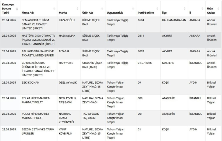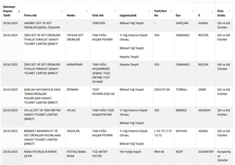 Gıda sahtekarlıkları devam ederken Tarım ve Orman Bakanlığı da yayınladığı listelerle bu uygunsuzlukları kamuoyuna duyurmayı sürdürüyor.