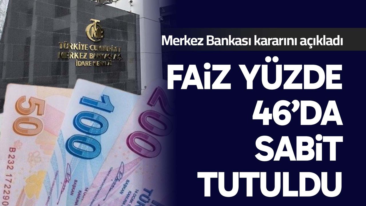 Ekonomi Haber - Türkiye Cumhuriyet Merkez Bankası (TCMB) faiz kararını açıkladı. Para Politikası Kurulu (Kurul), politika faizi olan bir hafta vadeli repo ihale faiz oranının yüzde 46’da sabit tutulmasına karar verdi. Kurul ayrıca, Merkez Bankası gecelik vadede borç verme faiz oranını yüzde 49’da, gecelik vadede borçlanma faiz oranını ise yüzde 44,5’te sabit tuttu.