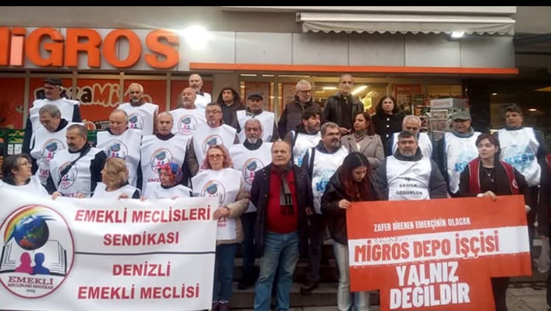 Denizli Emek ve Demokrasi Platformu’nun çağrısıyla bir araya gelen sendika temsilcileri, siyasi parti üyeleri ve çeşitli sivil toplum kuruluşları, Migros Demokrasi Şubesi önünde basın açıklaması gerçekleştirdi. Katılımcılar, “Migros işçisi yalnız değildir”, “Migros işçisi köle değildir”, “İşçilerin birliği Özilhan’ı yenecek”, “Yaşasın sınıf dayanışması” ve “Kurtuluş yok tek başına, ya hep beraber ya hiç birimiz” sloganlarını attı.