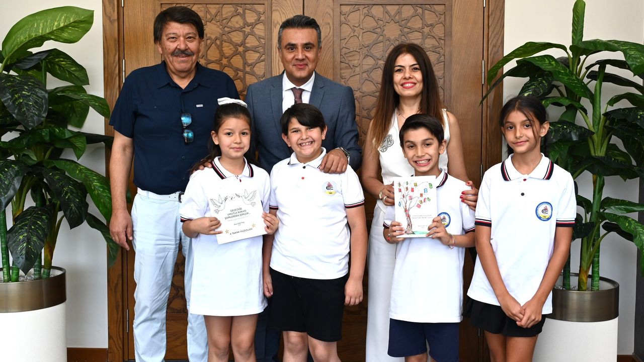 Denizli Haber- Denizli’de ilkokul öğrencileri tarafından hazırlanan “Geleceğe Umutla Bakan Şairlerden Şiirler” ve “Güzel Yürekli Yazarlardan Küçük Sözler Büyük Dersler” adlı kitapların minik yazarları, İl Milli Eğitim Müdürü Emre Çalışkan’ı makamında ziyaret etti.