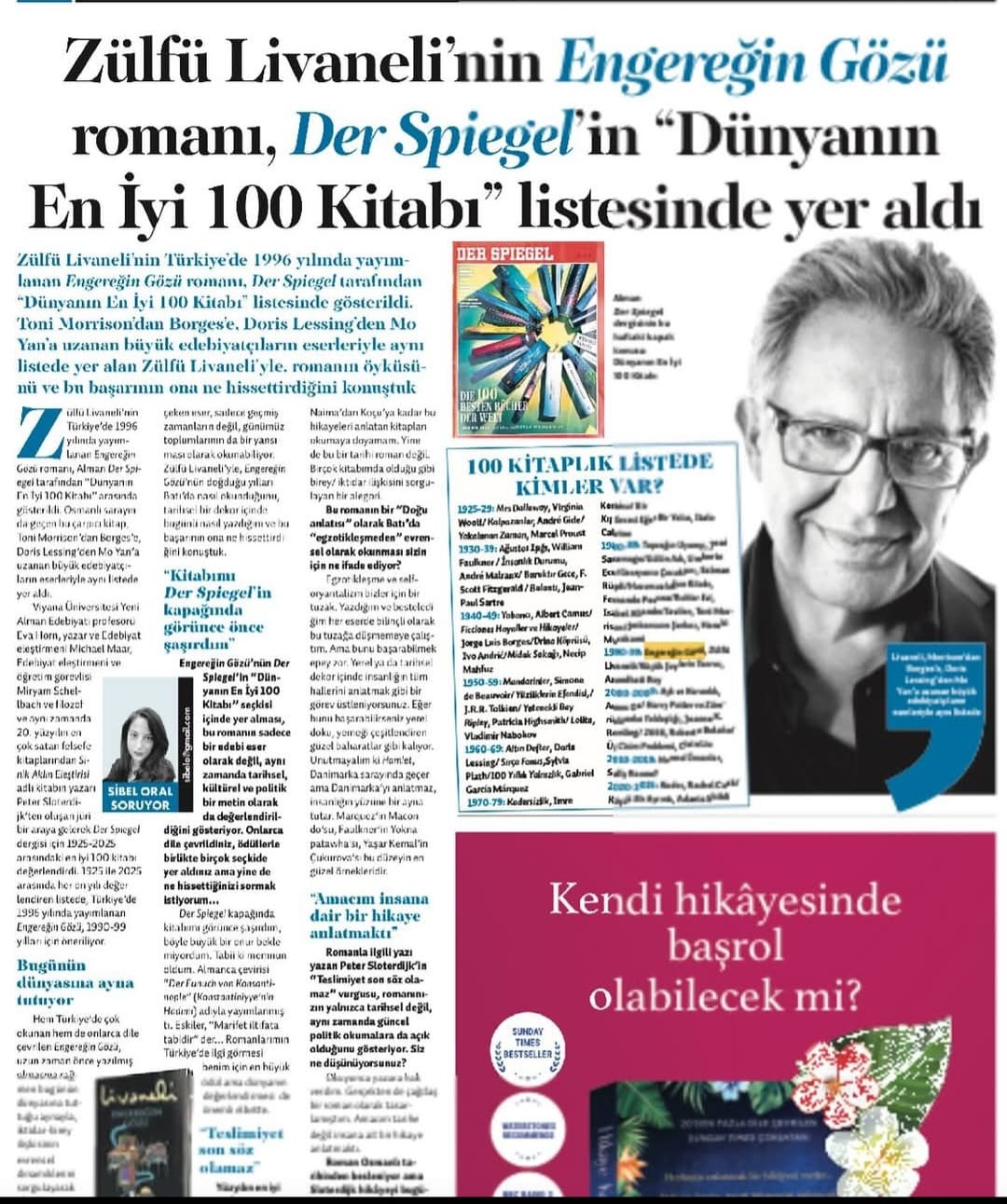 Ayrıca geçtiğimiz aylarda Engereğin Gözündeki Kamaşma romanı Der Spiegel’in “Dünya’nın En İyi 100 Kitabı” listesinde yer alan ünlü, besteci, söz yazarı, sinemacı, müzisyen ve yazar Zülfü Livaneli ile ilgili de bir iddiamız var. Romanları çok sayıda dile çevrilen ve çok satan Zülfü Livaneli bize göre; Nobel Edebiyat Ödülü’nün en çok yakıştığı Türk Yazarların başında geliyor. Nobelli bir Livaneli aynı zamanda dostu ve ağabeyi ünlü romancı ve düşün adamı Yaşar Kemal’in yarım bıraktığı bir öyküyü tamamlayarak (Nobel’i alarak) adeta onun vasiyetini de yerine getirmiş olacaktır. Viyana Üniversitesi Yeni Alman Edebiyatı profesörü Eva Horn, yazar ve Edebiyat eleştirmeni Michael Maar, Edebiyat eleştirmeni ve öğretim görevlisi Miryam Schellbach ve filozof ve aynı zamanda 20. yüzyılın en çok satan felsefe kitaplarından Sinik Aklın Eleştirisi adlı kitabın yazarı Peter Sloterdijk’ten oluşan jüri bir araya gelerek Der Spiegel dergisi için 1925-2025 arasındaki en iyi 100 kitabı değerlendirdi. 1925 ile 2025 arasında her on yılı değerlendiren listede; 1996 yılında yayımlanan Livaneli’nin çarpıcı Romanı Engereğin Gözü, 1990-99 yılları için önerildi. (Bir not; Romanın girişinde yer alan “mucize öyküsü” müthişti…)