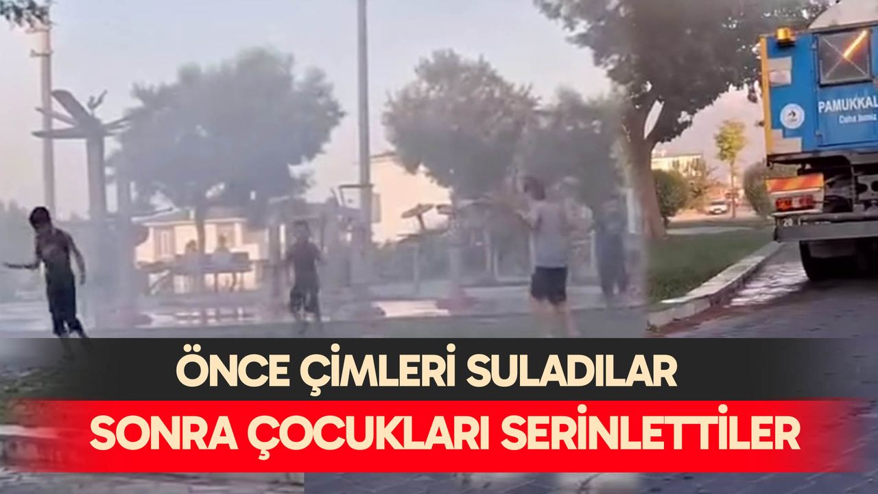 Pamukkale Belediyesi Park ve Bahçeler ekipleri tarafından refüjlerdeki çim ve çiçekleri sulamak için yapılan çalışmalar sırasında Deliktaş Mahallesi’nde cep telefonu kameralarına ilginç görüntüler yansıdı. Sulama aracını gören mahallenin çocukları yol ortasındaki refüje çıkarak, sulama aracının kendilerini de serinletmesini istedi. Ekiplerde çocukların bu isteklerini kırmayarak suyu basıncını ayarlayarak çocukları serinletti. Çocukların mutlulukları ve sevinçleri ise cep telefonu kameralarına yansıdı.