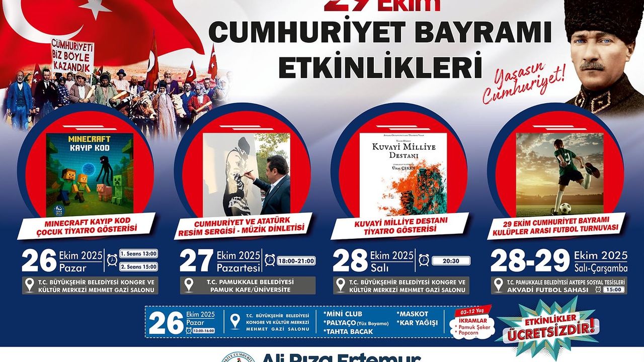 Denizli Haber - Pamukkale Belediyesi, 29 Ekim Cumhuriyet Bayramı dolayısıyla hazırladığı dört günlük özel programla, Cumhuriyet bilincini eğlenceli, sanatsal ve öğretici yollarla tüm ilçe sakinlerine aşılamayı hedefliyor.