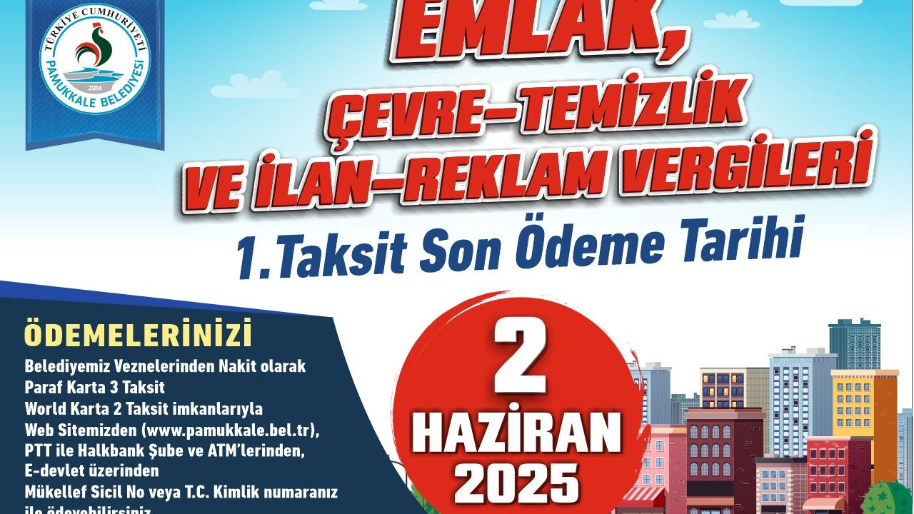 Pamukkale Belediyesi, Emlak, Çevre-Temizlik ve İlan-Reklam Vergisi birinci taksit ödemelerinin başladığını ve vatandaşların ödemelerini kolaylıkla yapması için tüm hazırlıkları tamamladı. Yılda 2 ayrı dönemde yapılan Emlak, Çevre-Temizlik ve İlan-Reklam Vergisi ödemelerinin birinci taksiti için tarih de belli oldu. Buna göre vatandaşlar 2 Haziran 2025 Pazartesi gününe kadar ödemelerini yapabilecekler.