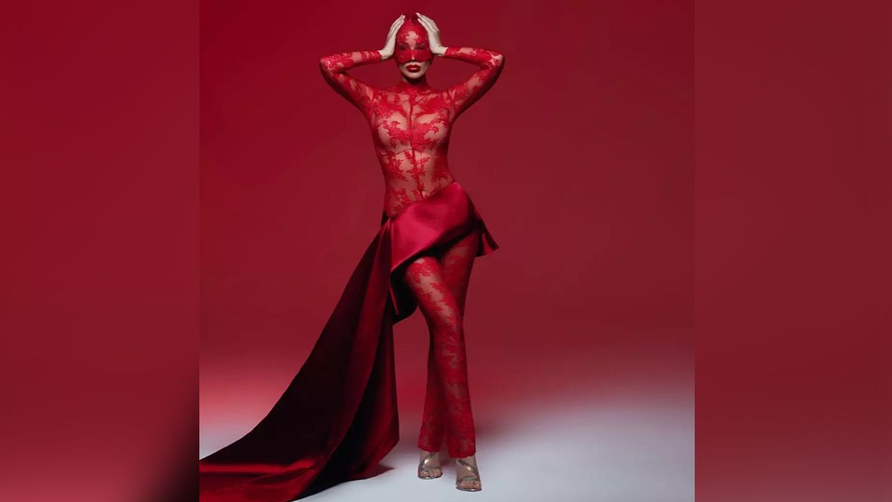 Baştan aşağı kırmızı transparan tercih eden şarkıcı yıllara meydan okuyan fiziğini sergiledi.