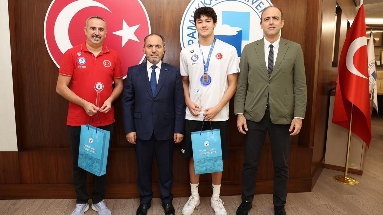 Denizli Haber - 1-6 Temmuz tarihleri arasında Slovakya’da düzenlenen Avrupa Gençler Şampiyonası’nda Yüzme Türk Milli Takımı ile 4x200 metre bayrak yarışmalarında 3’üncü olan ve aynı yarışmalarda bireysel kategorilerde 200 metre serbest stilde Avrupa 4’üncüsü olan, 19-24 Ağustos tarihleri arasında ise Romanya'da düzenlenen Dünya Gençler Yüzme Şampiyonası’nda 200 metre serbest stilde Dünya 4’üncüsü olan Pamukkale Üniversitesi Milli Yüzücüsü Ahmet Mete Boylu, Antrenörü PAÜ Spor Bilimleri Fakültesi personeli Musa Özcan ile birlikte Rektör Prof. Dr. Mahmud Güngör'ü makamında ziyaret ederek madalyalarını takdim etti.