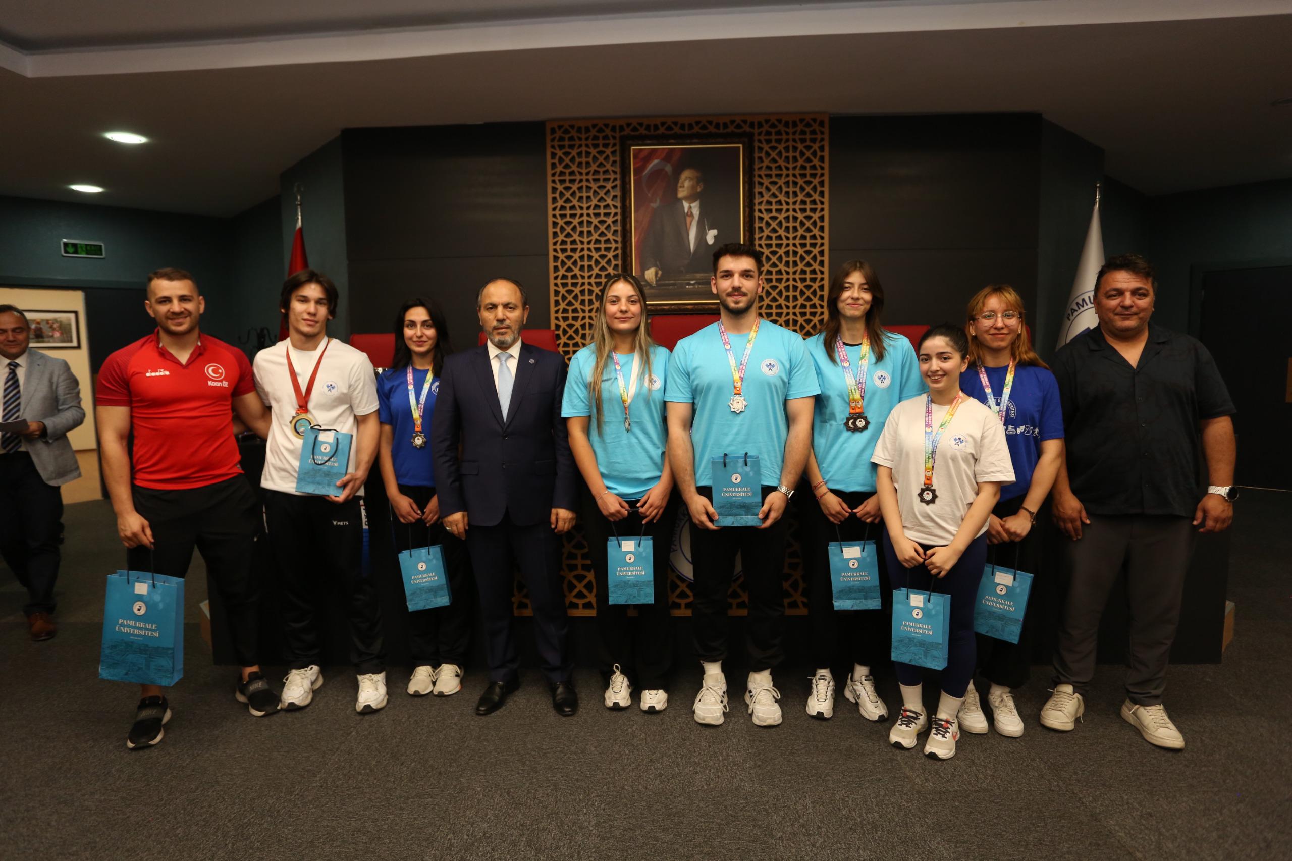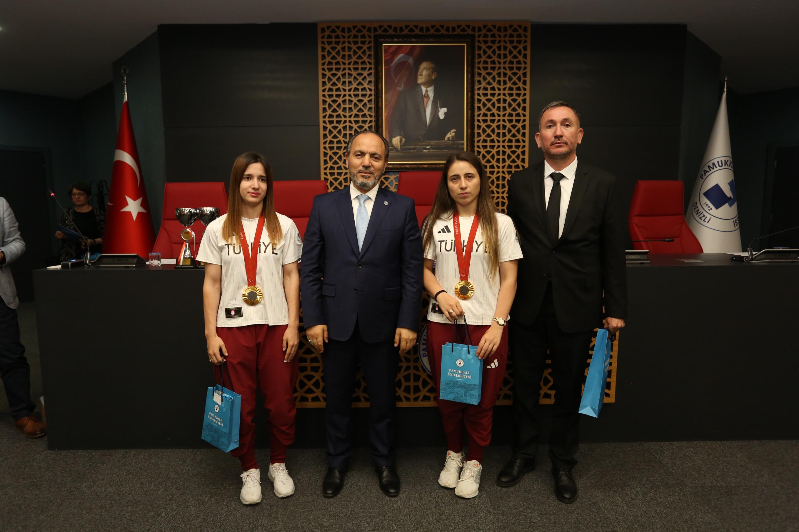 Denizli Haber - Rektörlük Senato Salonu’nda düzenlenen törende Türkiye Üniversite Sporları Federasyonu tarafından düzenlenen spor müsabakalarında atletizm, judo, bilek güreşi, kickbocks, muaythai, wushu, golbol dallarında dereceye giren ve madalya kazanan PAÜ’lü sporculara ve anterörlerine ödülleri Rektör Prof. Dr. Mahmud Güngör tarafından takdim edildi.
