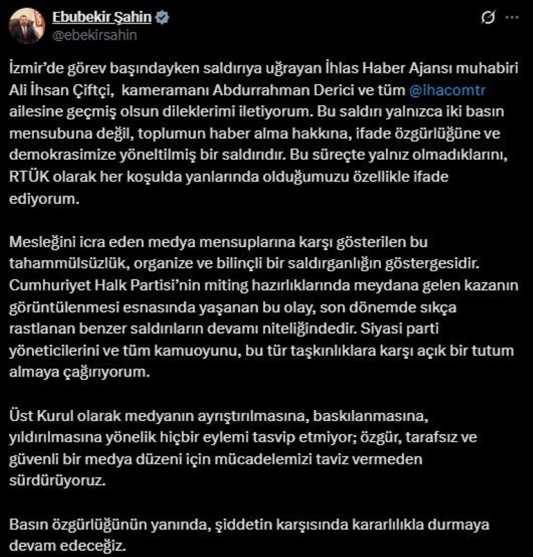 RTÜK Başkanı Şahin paylaşımında, Cumhuriyet Halk Partisi’nin (CHP) miting hazırlıklarında meydana gelen kazanın görüntülenmesi esnasında yaşanan bu olayın son dönemde sıkça rastlanan benzer saldırıların devamı niteliğinde olduğunu belirterek şu ifadelere yer verdi: "Siyasi parti yöneticilerini ve tüm kamuoyunu, bu tür taşkınlıklara karşı açık bir tutum almaya çağırıyorum. Üst Kurul olarak medyanın ayrıştırılmasına, baskılanmasına, yıldırılmasına yönelik hiçbir eylemi tasvip etmiyor; özgür, tarafsız ve güvenli bir medya düzeni için mücadelemizi taviz vermeden sürdürüyoruz. Basın özgürlüğünün yanında, şiddetin karşısında kararlılıkla durmaya devam edeceğiz."