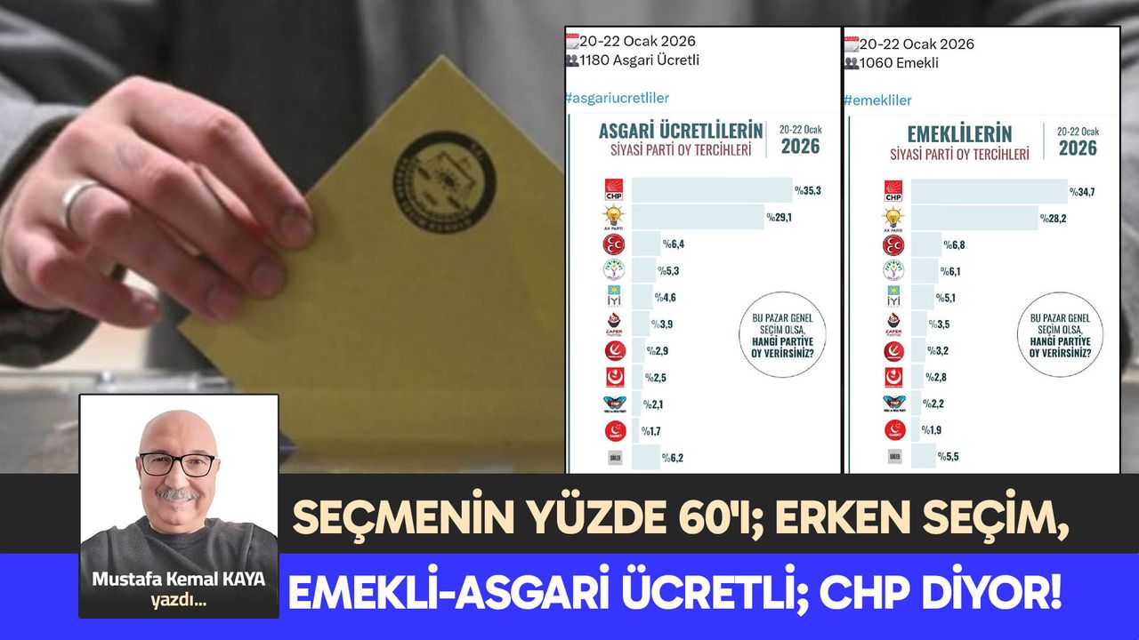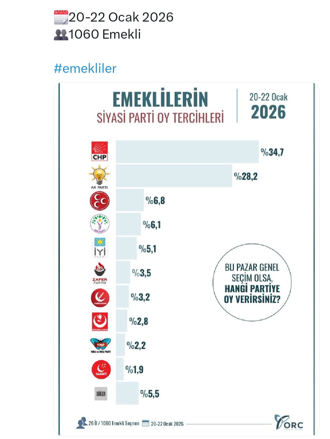 Öte yandan ORC Araştırma 26 ilde emekli ve asgari ücretli çalışanlarla yaptığı anketin bulgularını paylaştı. ORC Araştırma, asgari ücretle çalışan vatandaşlara, “Bu Pazar seçim olsa hangi partiye oy verirsiniz?” sorusunu yöneltildi. 20-22 Ocak 2026 tarihleri arasında 26 ilde 1180 asgari ücretli ve 1060 emekli ile yapılan ankette CHP'ye oy vereceğini söyleyenler ilk sırada çıktı. Ankete göre CHP'ye oy vereceğim diyen asgari ücretlilerin oranı yüzde 35,3 olurken; AKP diyenlerin oranı yüzde 29,1 oldu.