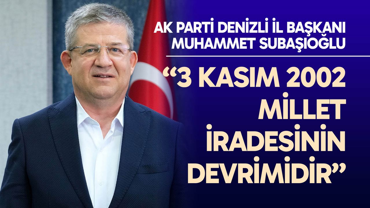 AK Parti’nin iktidara gelişinin yıl dönümünde açıklama yapan AK Parti Denizli İl Başkanı Muhammet Subaşıoğlu, 3 Kasım 2002’nin Türkiye siyasi tarihinde bir dönüm noktası olduğunu belirterek şu ifadeleri kullandı: “Takvim yaprakları 3 Kasım 2002’yi gösterdiğinde milletimizin güçlü desteğini alarak iktidara gelen AK Partimiz, sadece bir siyasi hareket olmamakla birlikte, bir millet iradesi devrimidir.