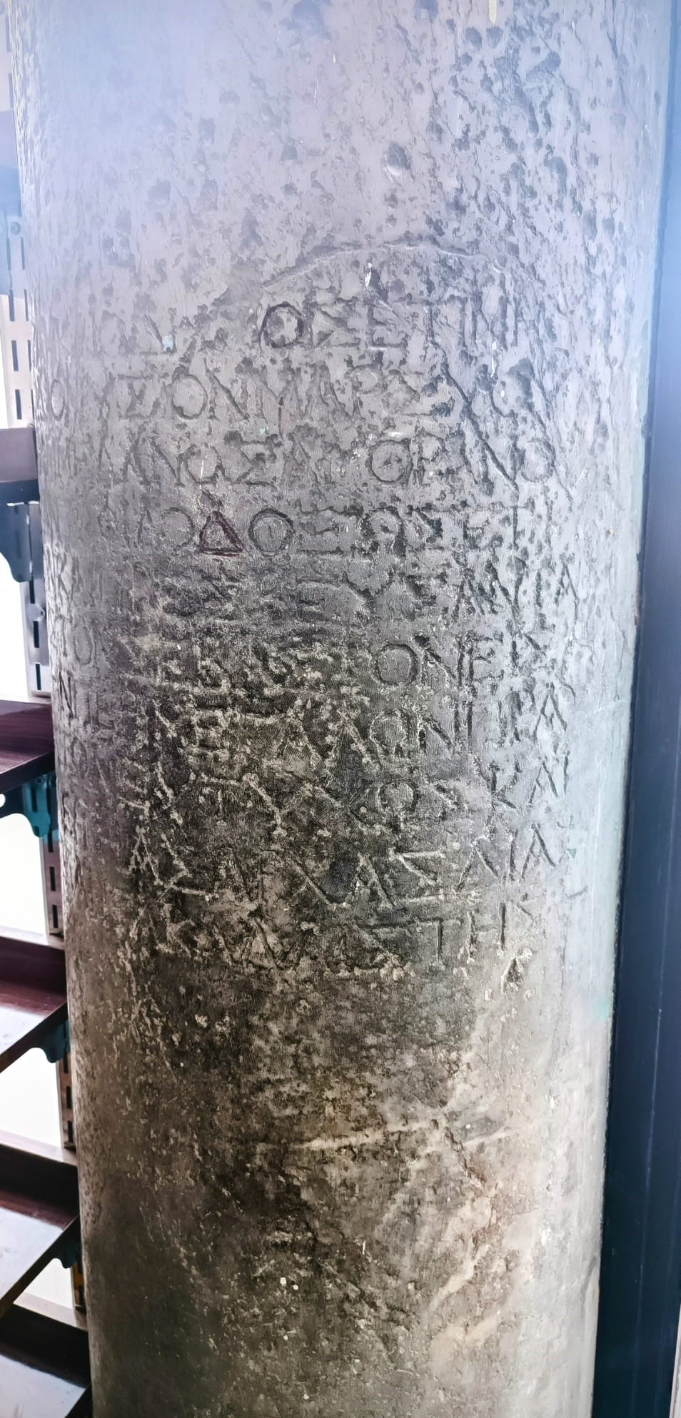 Tarihçi Özlem Camköz, Kütahya'da ziyaret ettiği Karagöz Ahmed Paşa Camii'nde tesadüfen sütun üzerindeki kitabeyi fark ederek, durumu Arkeolog Metin Türktüzün'e bildirdi. Yapılan incelemelerde kitabenin M.S. 3. yüzyıla tarihlendiği ve Roma İmparatorluğu döneminde pazar yerinde fiyatları denetleyen bir yetkili olan Marsyus Dionysios'un onurlandırıldığını belirten bir metin olduğu anlaşıldı. Kitabenin o dönemde şehrin önemli bir noktasına yerleştirildiği, ancak daha sonraki süreçte bir yapı içerisinde kullanıldıktan sonra caminin inşası sırasında buraya taşındığı düşünülüyor.