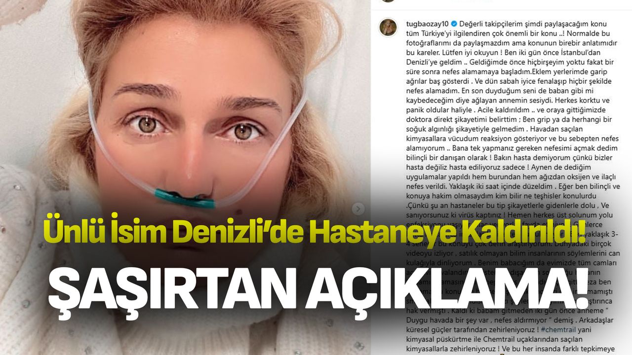 Eski manken ve sosyal medya fenomeni Tuğba Özay, Denizli ziyareti sırasında rahatsızlanarak hastaneye kaldırıldı. Özay, sağlık sorunlarının nedeninin atmosferdeki kimyasallar olduğunu öne sürdü.