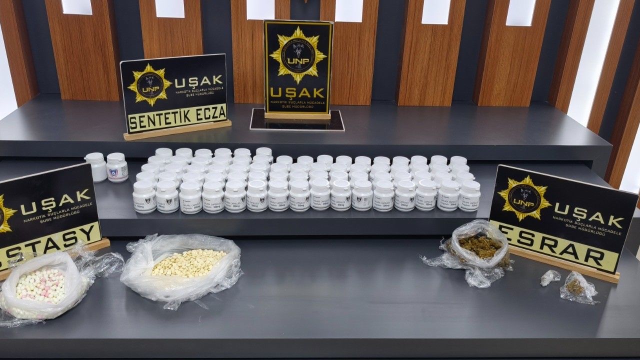 Uşak İl Emniyet Müdürlüğüne bağlı Narkotik Suçlarla Mücadele Şube Müdürlüğü ekipleri, otogarda şüphe üzerine bir çifti durdurdu. Çift üzerinde ve valizlerinde yapılan aramada 3 bin 795 adet sentetik ecza, bin 607 adet ecstasy ve bir miktar gram esrar ele geçirildi.