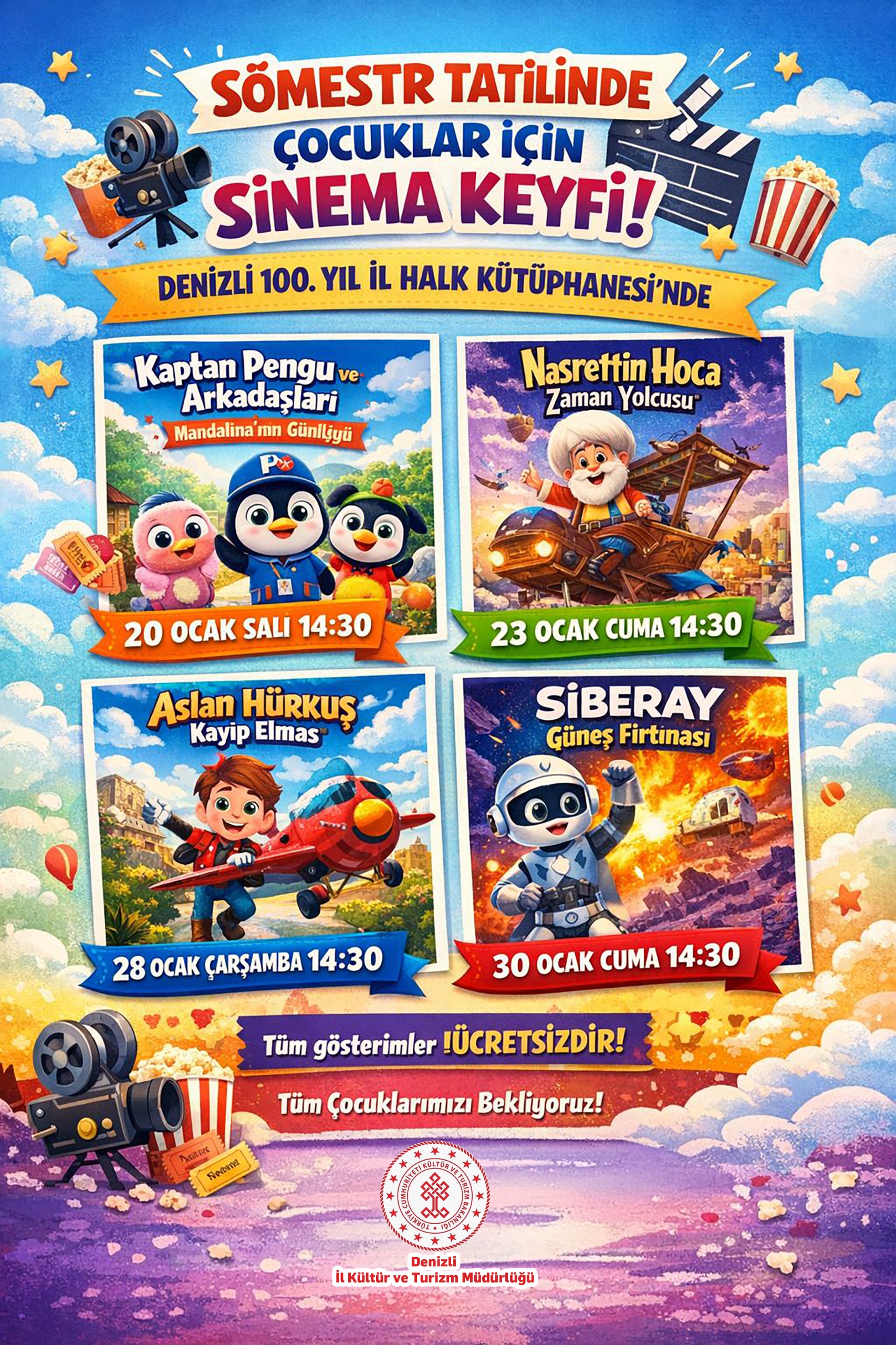 Denizli Haber - Denizli İl Kültür ve Turizm Müdürlüğü, yarıyıl tatilinde çocukların kültürel ve sanatsal gelişimlerine katkı sunmak amacıyla sinema etkinlikleri düzenleyecek. Etkinlikler kapsamında 20 Ocak Salı günü saat 14.30’da Kaptan Pengu ve Arkadaşları: Mandalina’nın Günlüğü, 23 Ocak Cuma günü saat 14.30’da ise Nasrettin Hoca: Zaman Yolcusu çocuklarla buluşacak.