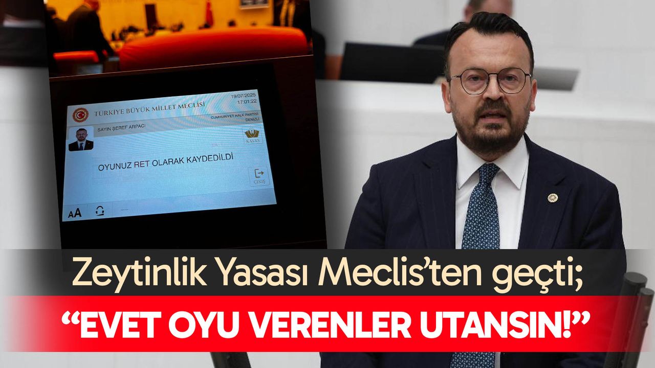 Denizli Haber-Geçtiğimiz hafta TBMM'de birkaç gün boyunca oylanan kanun teklifinin tamamı, 199 oya karşı 255 oyla kabul edildi. “Biz bu ihanete karşı durduk. RED oyu verdik!” diyen CHP Denizli Milletvekili Şeref Arpacı, “ Zeytinlikleri talana açacak kanun teklifi, komisyonda 26 saat süren aralıksız direnişimize, Genel Kurul’daki günler süren mücadelemize ve yurttaşlarımızın Meclis önünde yükselen haykırışlarına rağmen, ne yazık ki AKP ve MHP milletvekillerinin oylarıyla kabul edildi. Bu teklife “evet” diyenler sadece hukuku değil; toprağı, ağacı, zeytini, suyu, arıyı, emeği ve geleceğimizi hiçe saymıştır. Unutulmasın ki; bu topraklar bize miras değil, emanettir! Bu emanete ihanet edenleri ne halk affedecek, ne vicdan affedecek, ne de tarih! Biz bu ihanete karşı durduk. RED oyu verdik!” ifadelerini kullandı.
